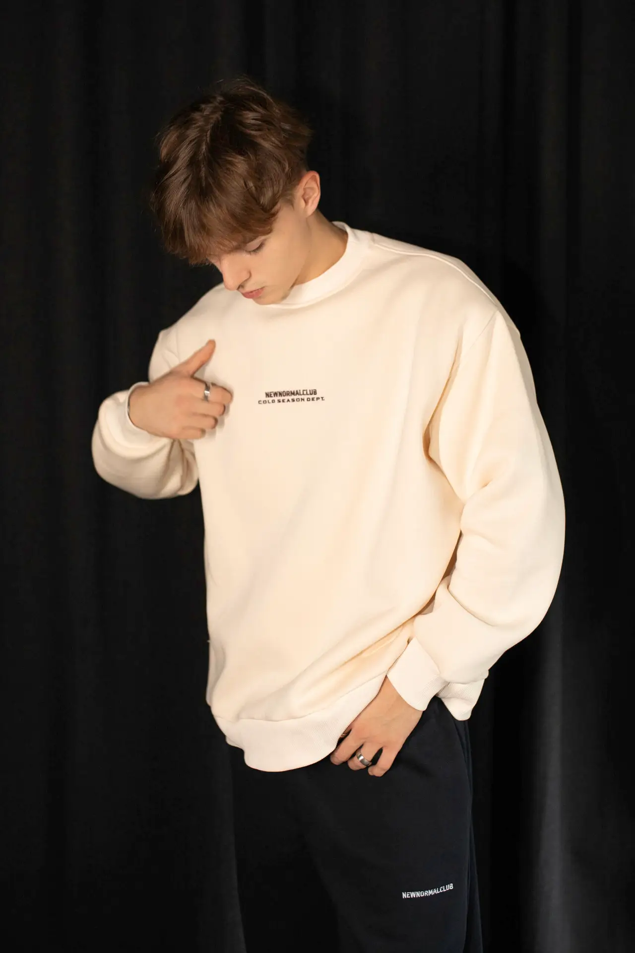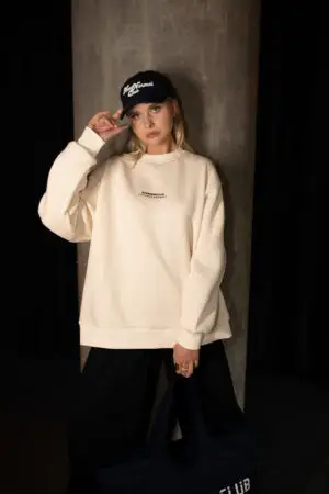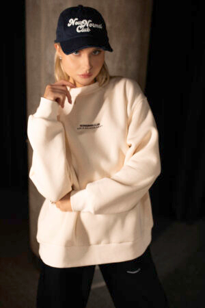 Priekyje – subtilus, siuvinėtas „NEW NORMAL CLUB / COLD SEASON DEPT.“ užrašas. Nugara – visiškai švari, kas leidžia kurti minimalistinius, bet išraiškingus įvaizdžius.