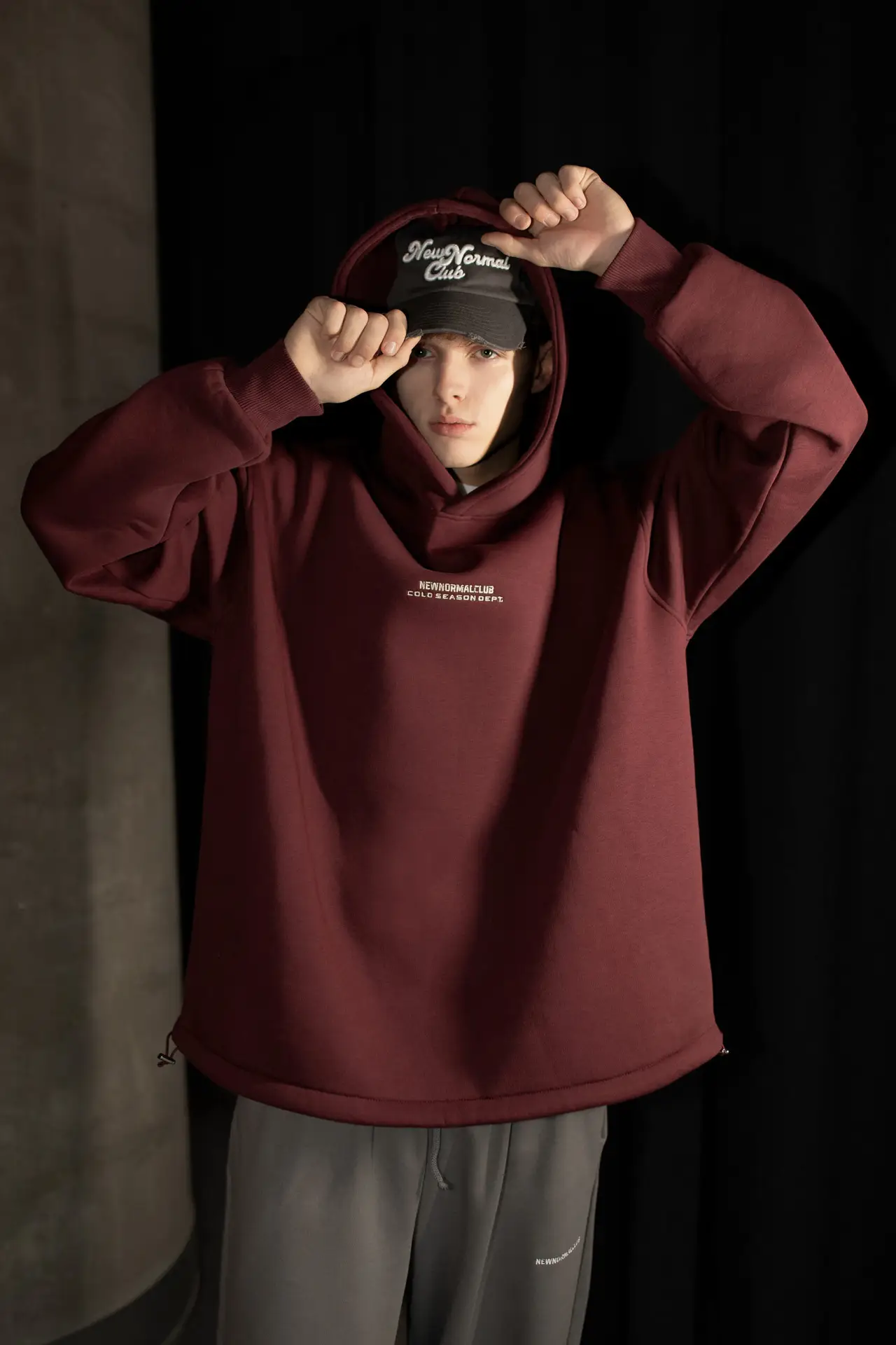 Priekyje – subtilus, siuvinėtas „NEW NORMAL CLUB / COLD SEASON DEPT.“ užrašas, atspindintis šaltojo sezono estetiką ir šiuolaikinio miesto stiliaus dvasią. Nugara – švari, be spaudos, pabrėžianti minimalistinį įvaizdį.